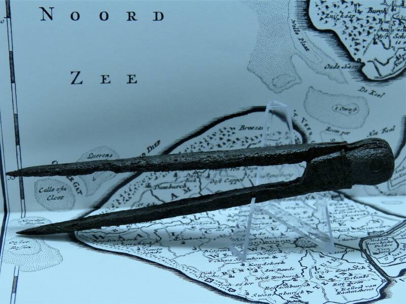 Omdat het hier ging om een enkel voorwerp, behoefde ik hier dan ook geen grote vitrine voor te vervaardigen. Ik heb gekozen voor een wat grotere fotolijst waarin ik op de achtergrond een oude landkaart van Walcheren uit circa anno 1650 heb geplaatst.